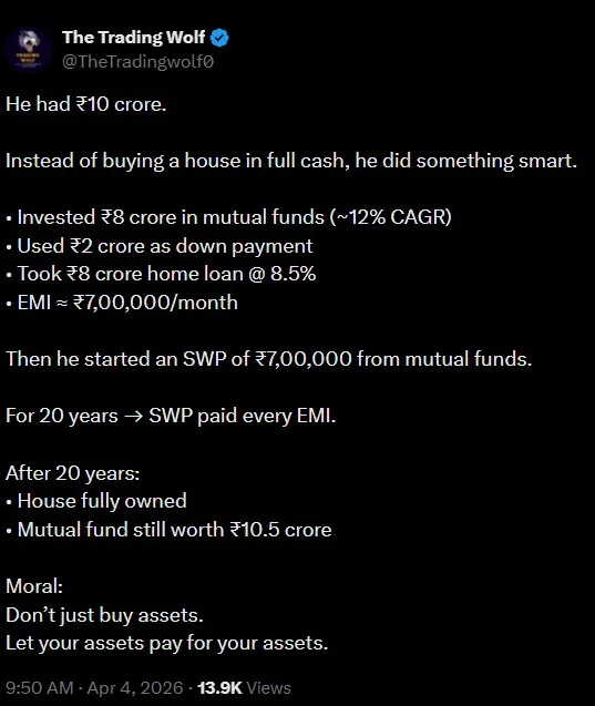 सर्वात महत्त्वाची गोष्ट म्हणजे त्याने आपल्या म्युच्युअल फंड गुंतवणुकीतून सिस्टेमॅटिक विथड्रॉल प्लॅन म्हणजेच SWP सुरू केला. या SWP मधून तो दर महिन्याला सुमारे 7 लाख रुपये काढत होता आणि त्याच पैशातून EMI भरत होता. म्हणजेच त्याच्या गुंतवणुकीनेच त्याचे कर्ज फेडण्यास मदत केली.